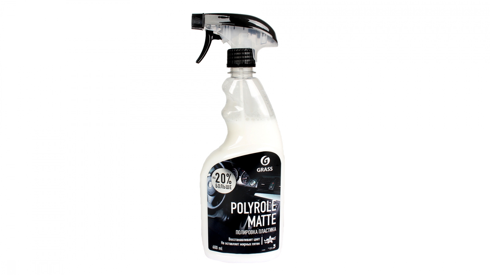 Профессиональный матовый полироль Grass «Polyrole Matte» для обработки приборных панелей, неокрашенных бамперов, покрышек, для очистки и полировки изделий из кожи, дерева винила, пластика и резины, не оставляет жирных пятен, препятствует оседанию пыли придает матовый блеск, обладает приятным ароматом. Состав: ≥30% очищенная вода; ≥5%, но <15% полидиметилсилоксановая эмульсия, <5%: ароматизирующая добавка, метилхлороизотиазолинон, метилизотиазолинон. Способ применения: Нанести на поверхность с помощью распылителя или губки, распределить равномерно на поверхности круговыми движениями. Не допускать попадания на стекла и зеркала.